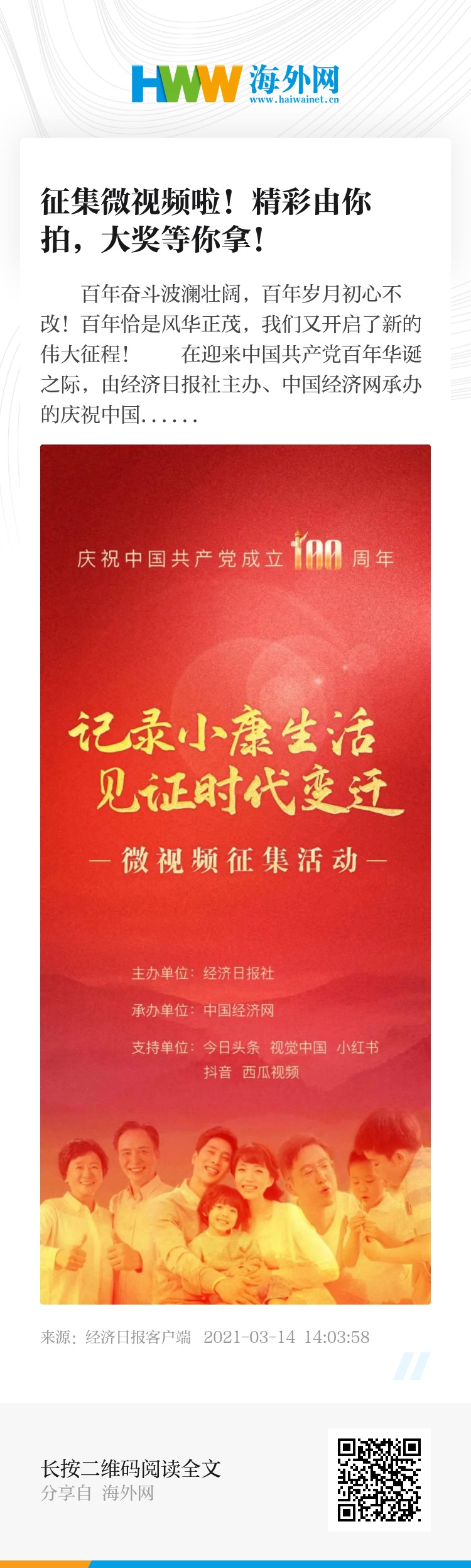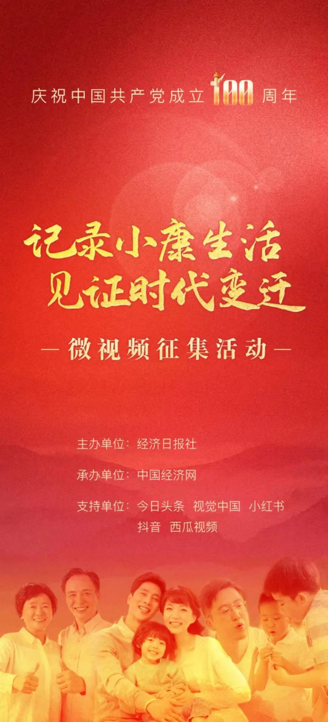 在迎来中国共产党百年华诞之际,由经济日报社主办、中国经济网承办的庆祝中国共产党成立100周年微视频征集活动,邀请您一起用镜头记录小康生活,见证时代变迁。