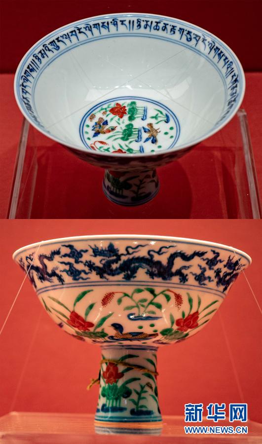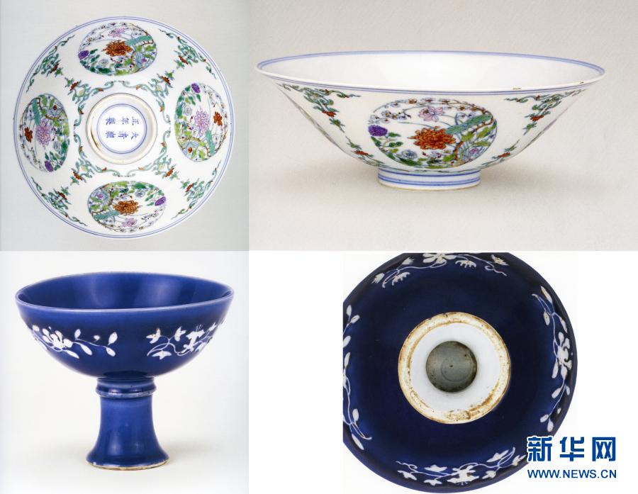 这张拼版照片显示的是青花五彩莲池鸳鸯纹高足碗(1月26日摄)。新华社记者 普布扎西 摄