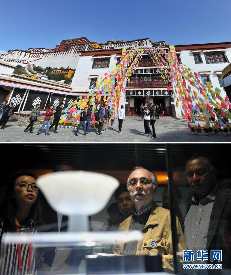 拼版照片:上图为布达拉宫珍宝馆文物展出现场(2019年10月5日摄),下图为参观者在观看布达拉宫精品文物展上展出的瓷器(2016年9月12日摄)。新华社记者 晋美多吉 摄