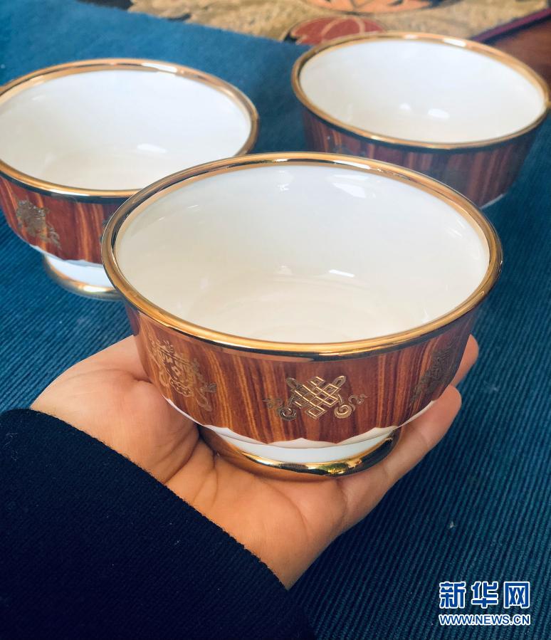 这是出席2015年西藏自治区成立50周年庆祝活动的中央代表团赠送给西藏农牧民的骨质瓷酥油茶杯套装(2月5日摄)。新华社记者 孙非 摄