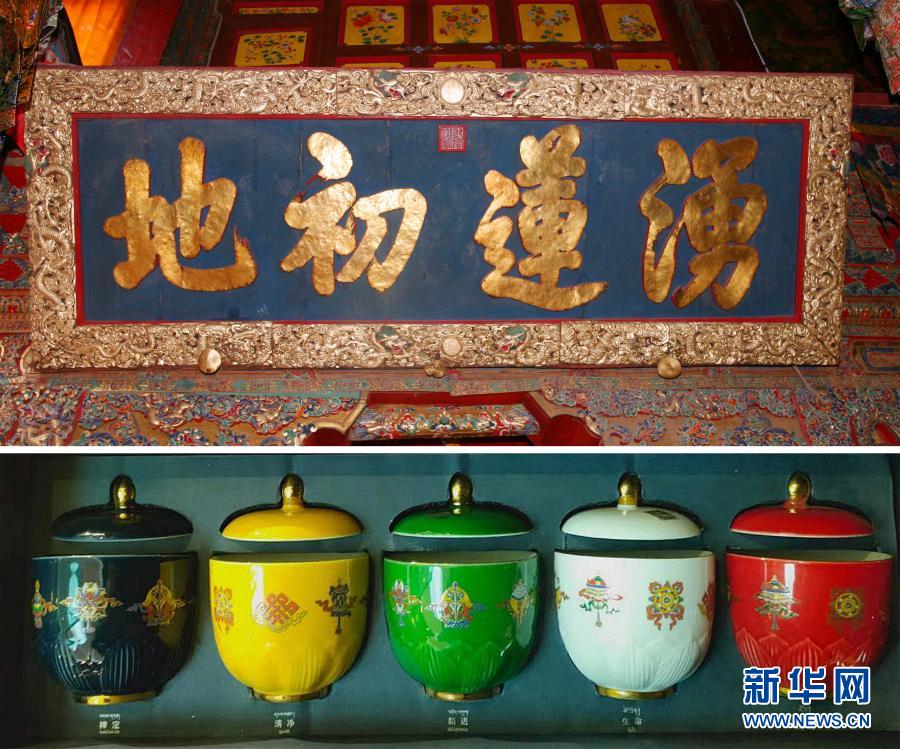 拼版照片:上图为悬挂于布达拉宫西大殿正中上方、乾隆赐予八世达赖喇嘛的御笔金字匾额“涌莲初地”;下图为布达拉宫红山脚下文创体验店内的“莲花五蕴杯”文创瓷器(1月26日摄)。新华社记者 孙非 摄