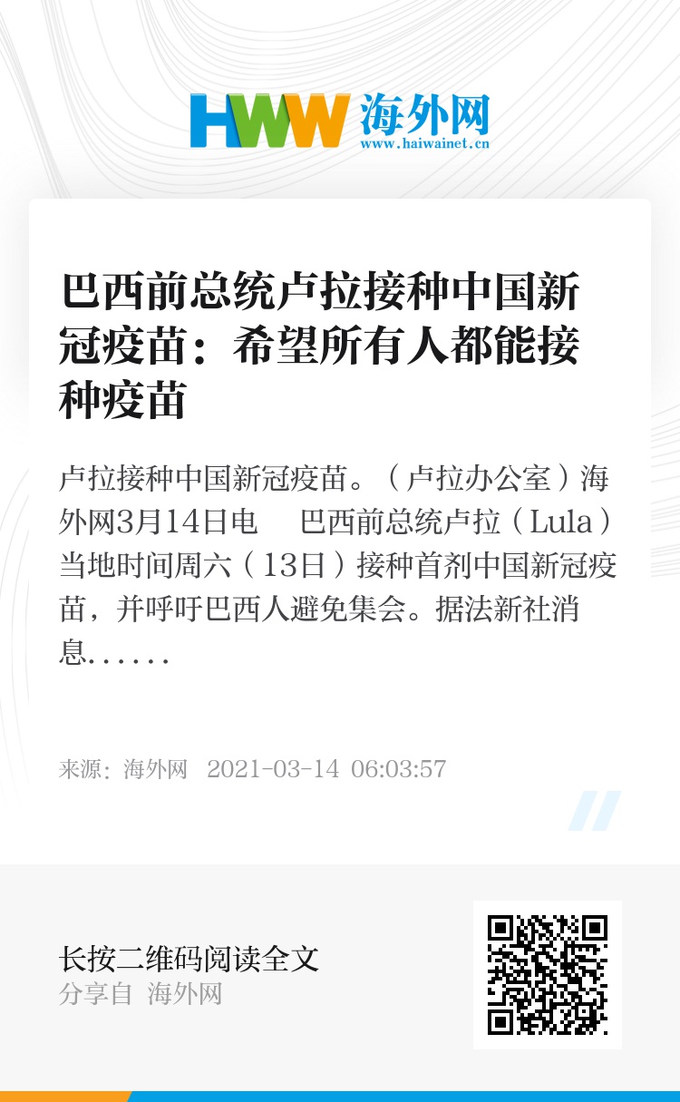 海外网3月14日电 巴西前总统卢拉(Lula)当地时间周六(13日)接种首剂中国新冠疫苗,并呼吁巴西人避免集会。