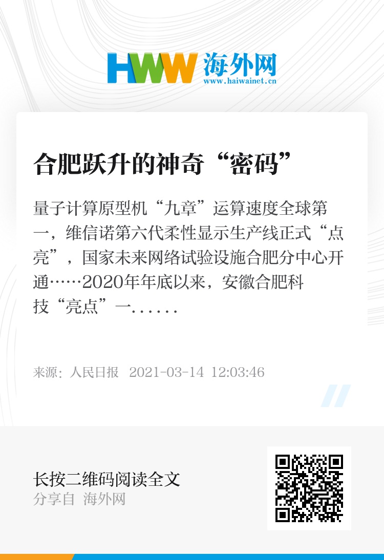 量子计算原型机“九章”运算速度全球第一,维信诺第六代柔性显示生产线正式“点亮”,国家未来网络试验设施合肥分中心开通……2020年年底以来,安徽合肥科技“亮点”一个接着一个,令人目不暇接。