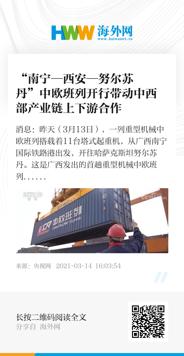 央视网消息:昨天(3月13日),一列重型机械中欧班列搭载着11台塔式起重机,从广西南宁国际铁路港出发,开往哈萨克斯坦努尔苏丹。这是广西发出的首趟重型机械中欧班列。