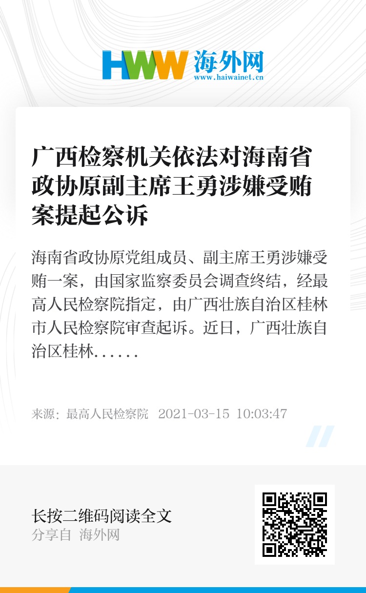 海南省政协原党组成员、副主席王勇涉嫌受贿一案,由国家监察委员会调查终结,经最高人民检察院指定,由广西壮族自治区桂林市人民检察院审查起诉。近日,广西壮族自治区桂林市人民检察院已向桂林市中级人民法院提起公诉。