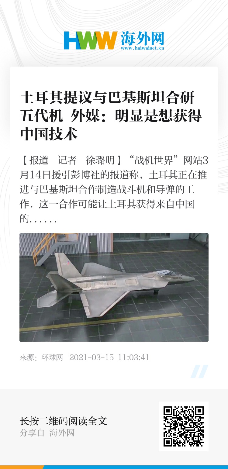 【环球网报道 记者 徐璐明】“战机世界”网站3月14日援引彭博社的报道称,土耳其正在推进与巴基斯坦合作制造战斗机和导弹的工作,这一合作可能让土耳其获得来自中国的技术。