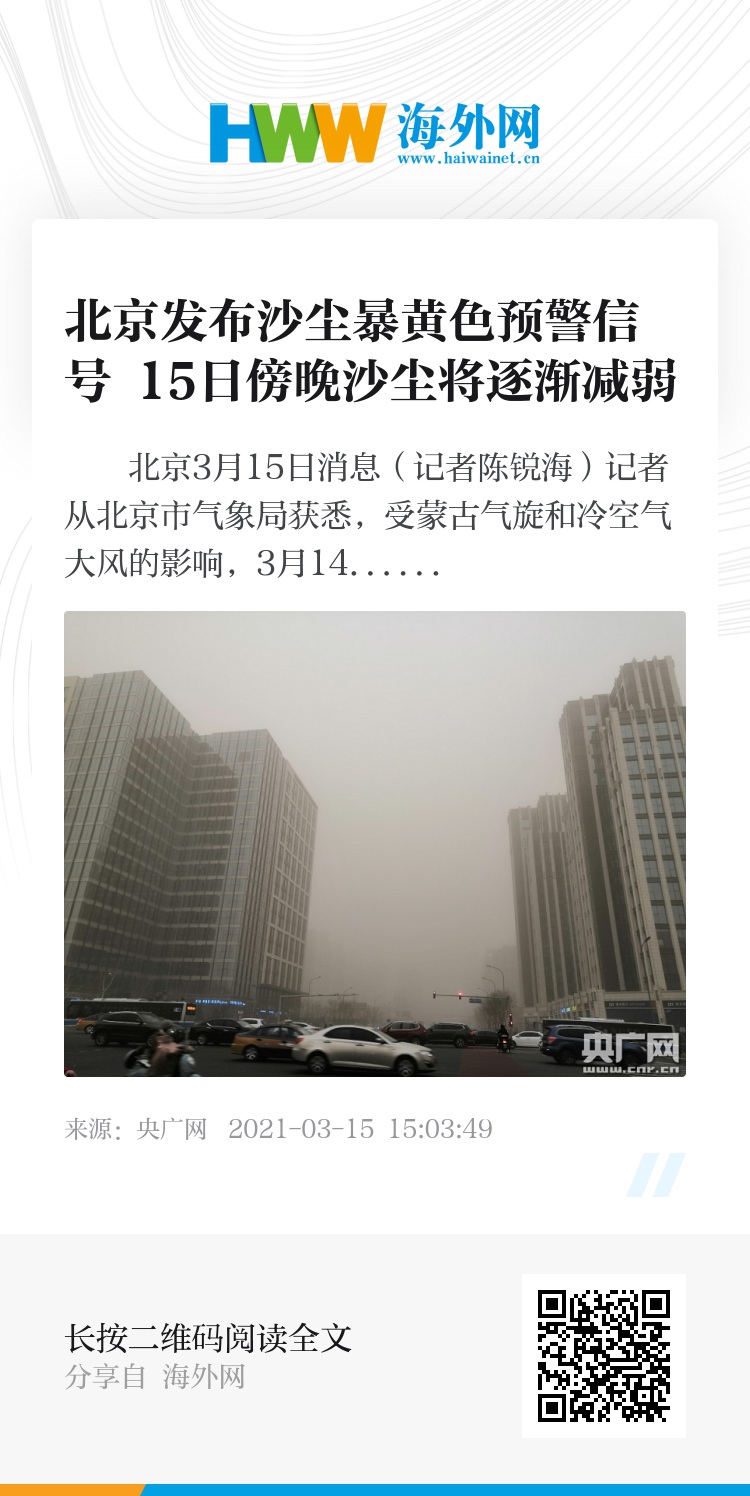 针对此次大风沙尘暴天气,北京市气象台分别于14日17时15分、17时20分发布大风蓝色和沙尘蓝色预警信号,并于15日7时25分升级发布沙尘暴黄色预警信号。