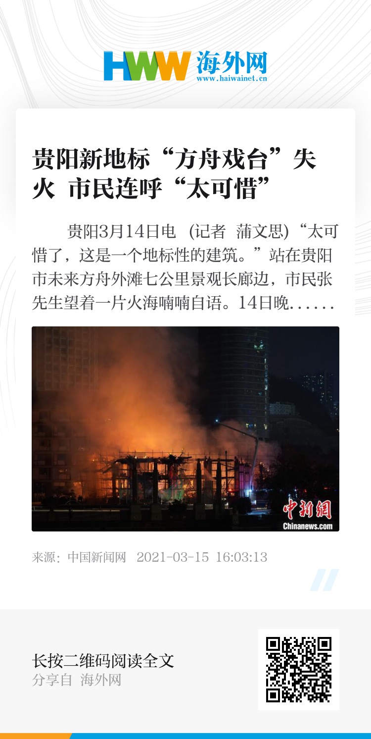 中新网贵阳3月14日电 (记者 蒲文思)“太可惜了,这是一个地标性的建筑。”站在贵阳市未来方舟外滩七公里景观长廊边,市民张先生望着一片火海喃喃自语。14日晚,贵阳市方舟戏台突发大火,接警后,消防部门全力扑救。