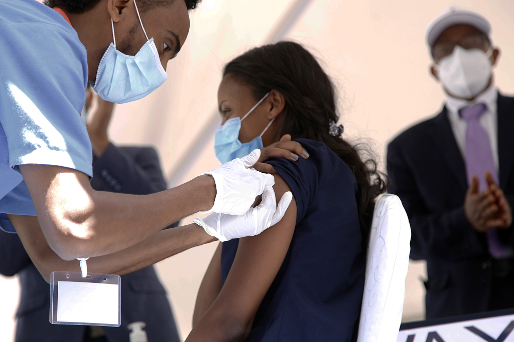 当地时间2021年3月13日,埃塞俄比亚亚的斯亚贝巴启动新冠疫苗接种工作,医护人员陆续接种新冠疫苗。图片来源:人民视觉