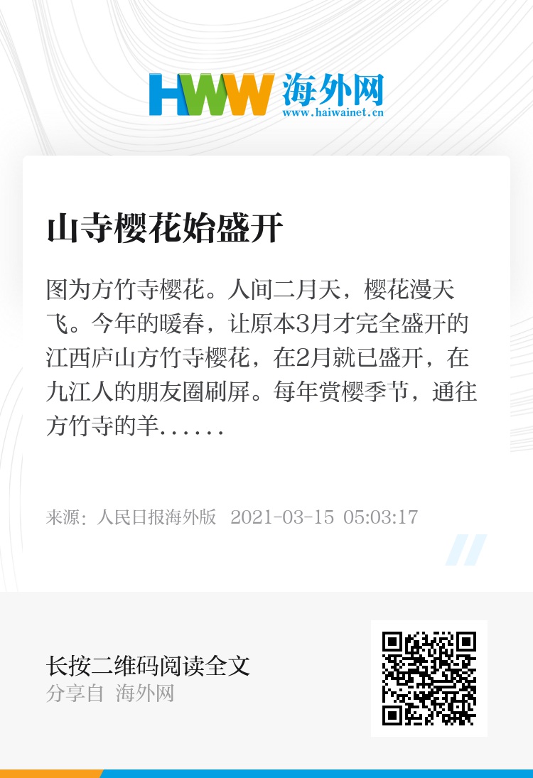 人间二月天,樱花漫天飞。今年的暖春,让原本3月才完全盛开的江西庐山方竹寺樱花,在2月就已盛开,在九江人的朋友圈刷屏。每年赏樱季节,通往方竹寺的羊肠小道都会被车辆围堵得水泄不通,有经验的赏花者把车停得远远的,选择步行前往。