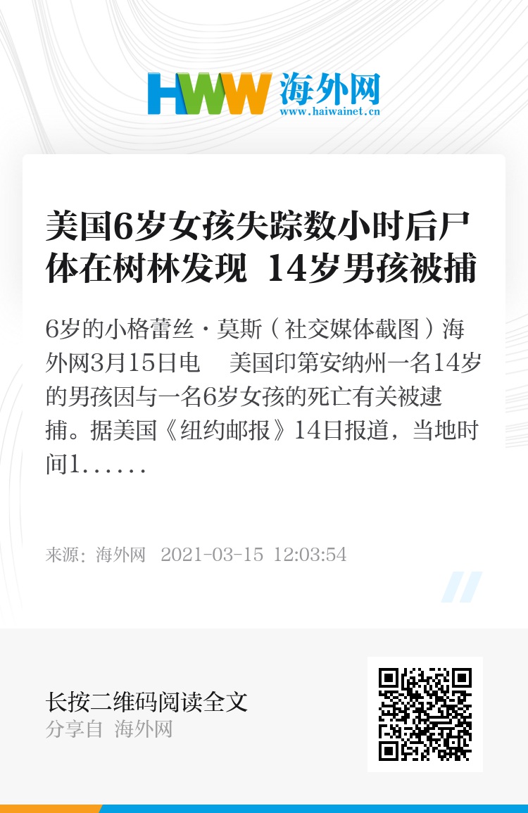 海外网3月15日电 美国印第安纳州一名14岁的男孩因与一名6岁女孩的死亡有关被逮捕。