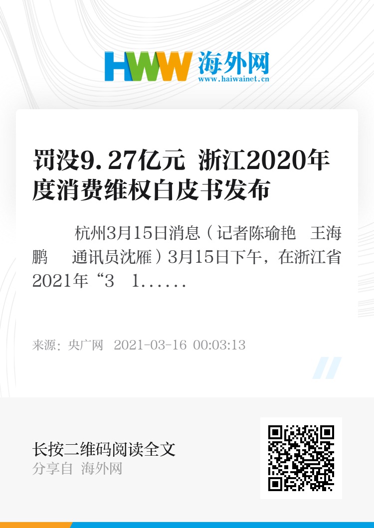 央广网杭州3月15日消息(记者陈瑜艳 王海鹏 通讯员沈雁)3月15日下午,在浙江省2021年“3・15国际消费者权益日”系列活动启动仪式上,《2020年度浙江省消费维权白皮书》(以下简称《白皮书》)重磅发布。