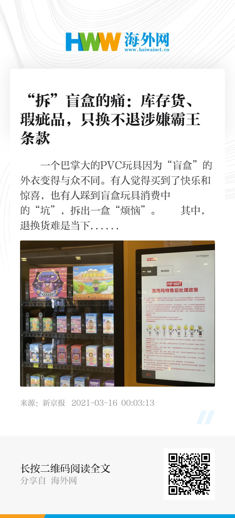 “盲盒玩具”退换货难受到不少消费者吐槽。据媒体公开报道,2020年12月19日,辽宁铁岭一位消费者花295元在泡泡玛特天猫抽盒机上购买了5个盲盒,快递拆开后发现3个都存在质量问题,其中还有一个已明显损坏。联系泡泡玛特客服后,对方称3个产品不能退,只能换全新备品。