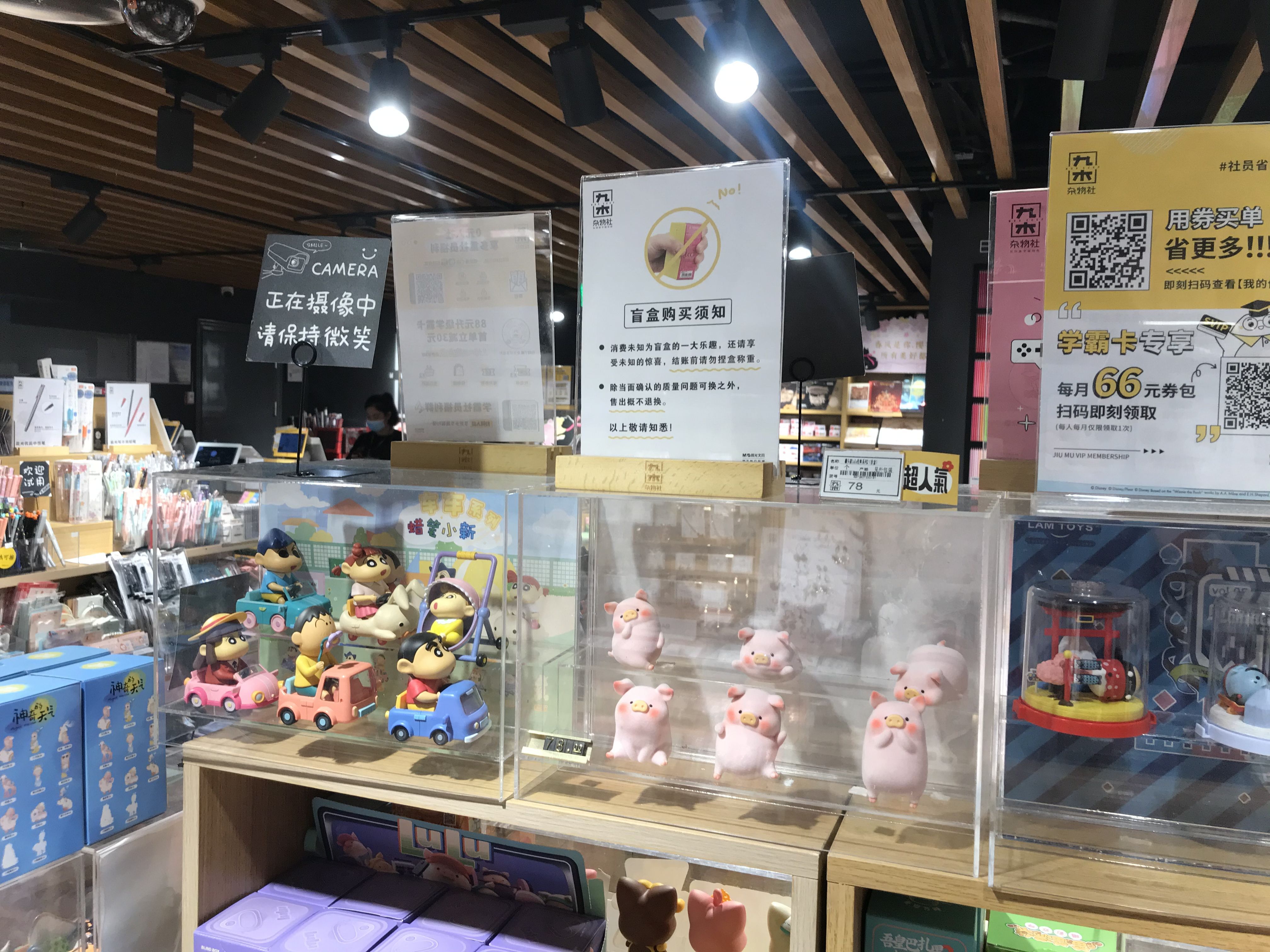 此外,九木杂物社西单大悦城店内张贴的“盲盒购买须知”上则显示,“除当面确认的质量问题可换之外,售出概不退换。”对于购买须知上的说法,现场工作人员口头表示,现场拆盒有质量问题会现场换货,如果离店后拆盒出现质量问题,也可以联系门店。
