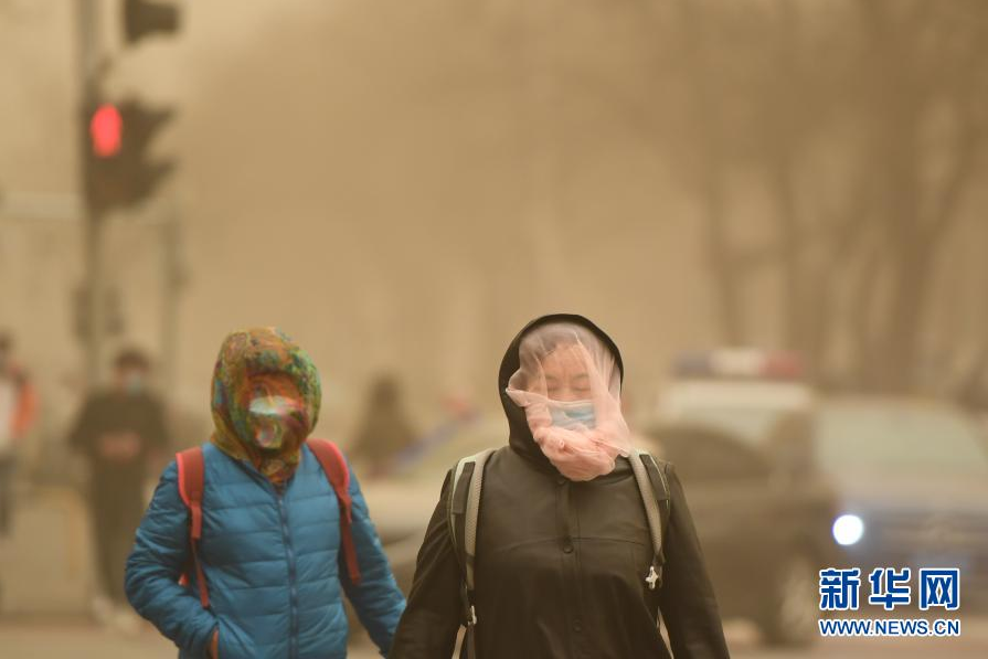 3月15日,在北京市东四环外朝阳路,行人脸上蒙着纱巾出行。当日,北京市遭遇沙尘天气。新华社记者 鞠焕宗 摄