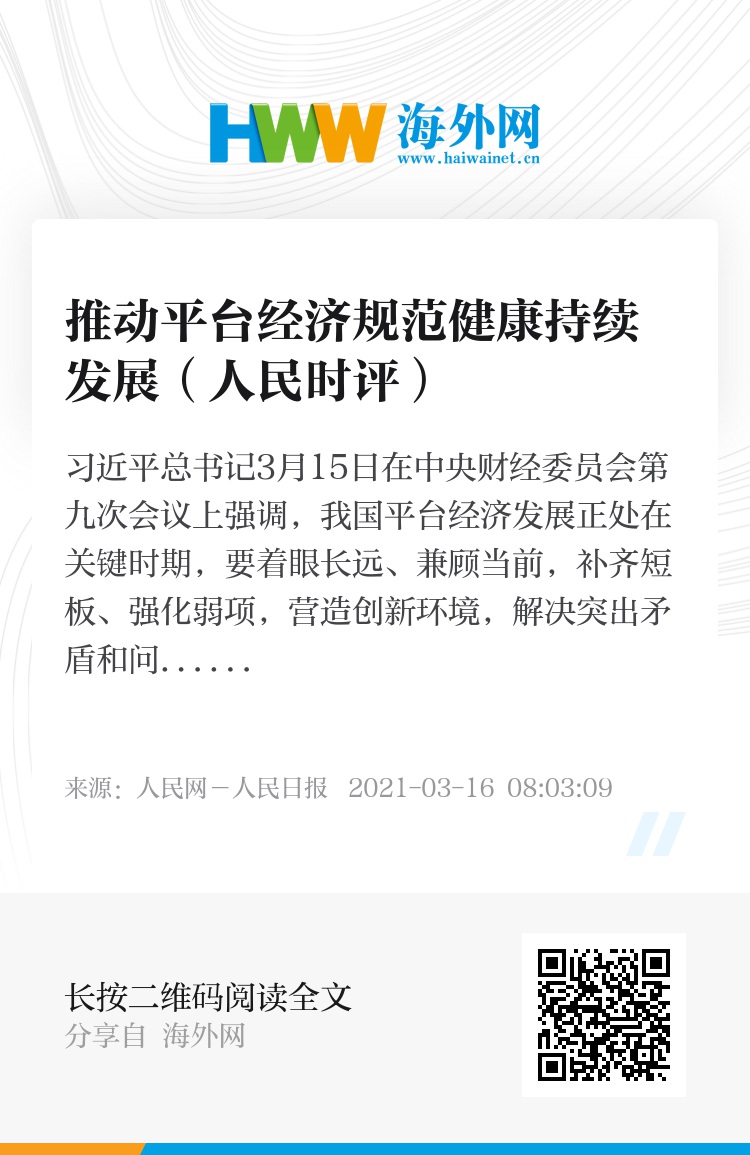 习近平总书记3月15日在中央财经委员会第九次会议上强调,我国平台经济发展正处在关键时期,要着眼长远、兼顾当前,补齐短板、强化弱项,营造创新环境,解决突出矛盾和问题,推动平台经济规范健康持续发展。今年的《政府工作报告》提出:“国家支持平台企业创新发展、增强国际竞争力,同时要依法规范发展,健全数字规则。”