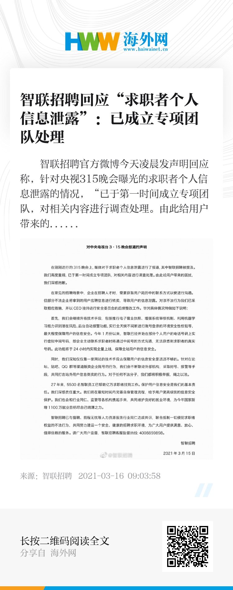 智联招聘官方微博今天凌晨发声明回应称,针对央视315晚会曝光的求职者个人信息泄露的情况,“已于第一时间成立专项团队,对相关内容进行调查处理。由此给用户带来的困扰,我们深感抱歉。”