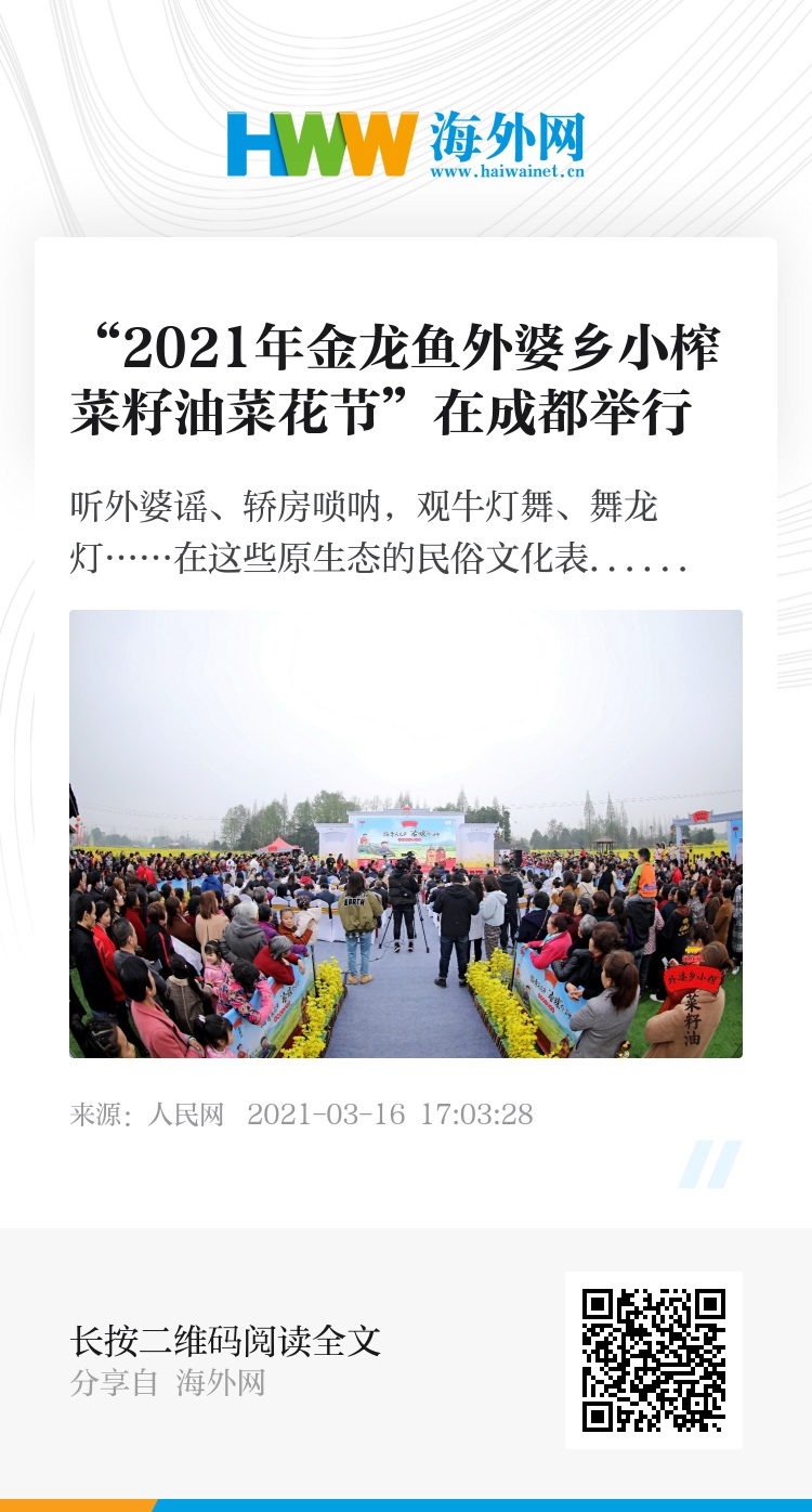 听外婆谣、轿房唢呐,观牛灯舞、舞龙灯……在这些原生态的民俗文化表演中,“2021年金龙鱼外婆乡小榨菜籽油菜花节”在成都都江堰天马镇金陵社区开幕,吸引成都市民来此观花海、赏民俗,品美食,共赴一场美食与美景交融的盛会。
