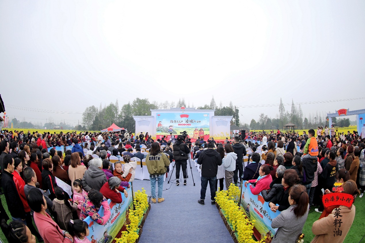 据介绍,川西平原成片的油菜花田,是金龙鱼外婆乡小榨菜籽油的生态基地。自2015年以来,每年春天,在油菜花盛开的季节,外婆乡小榨菜籽油都会举办菜花节。