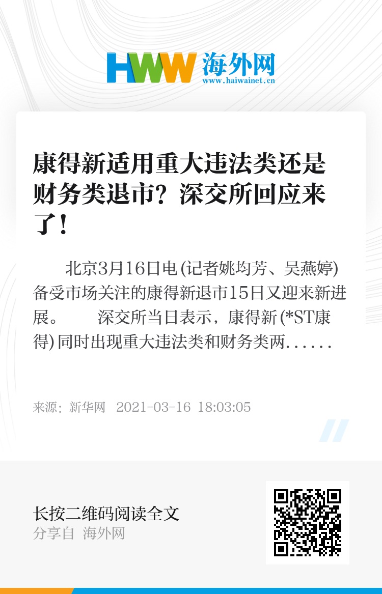 深交所当日表示,康得新(*ST康得)同时出现重大违法类和财务类两项终止上市情形,为明确市场预期,将按照先触及先适用的原则终止其股票上市交易。康得新财务类终止上市的时点早于重大违法强制退市时点,根据相关规定,深交所将按照财务类退市情形对公司股票启动终止上市程序。