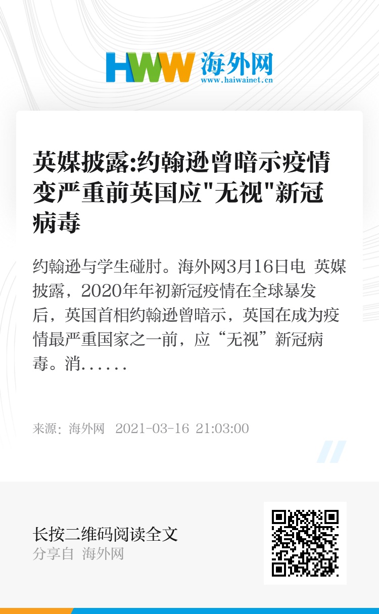 海外网3月16日电 英媒披露,2020年年初新冠疫情在全球暴发后,英国首相约翰逊曾暗示,英国在成为疫情最严重国家之一前,应“无视”新冠病毒。消息的披露在该国政府应对这种大流行时甩出了一记重磅炸弹。