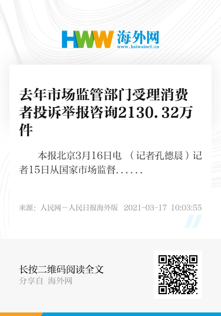 本报北京3月16日电 (记者孔德晨)记者15日从国家市场监督管理总局获悉,2020年,全国市场监管部门通过全国12315平台、电话、传真、窗口等渠道共受理消费者投诉举报咨询2130.32万件,为消费者挽回经济损失44.03亿元。
