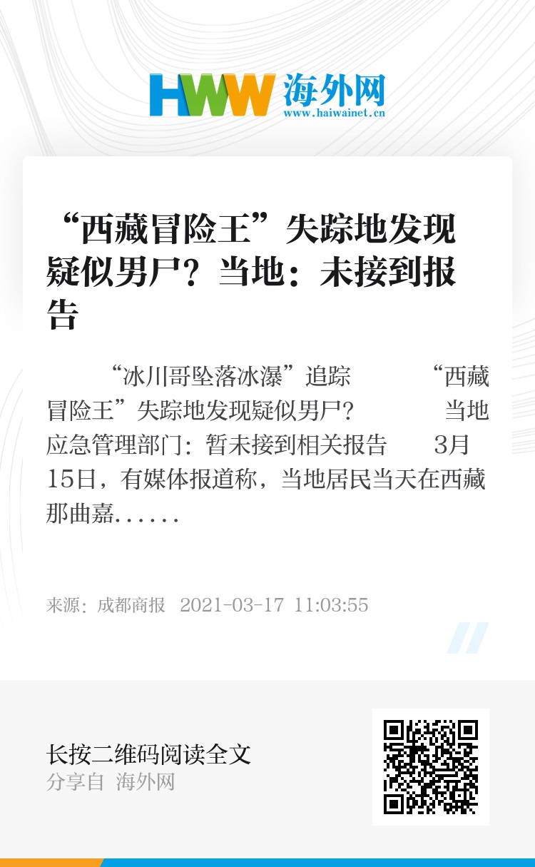 3月15日,有媒体报道称,当地居民当天在西藏那曲嘉黎县的依噶冰川的“水泡子”里发现一具男性遗体,当即报警。目前,警方正在按照法定程序处理中。对此,网友们纷纷猜测,这是否与此前在依噶冰川瀑布消失的“西藏冒险王”王相军有关。