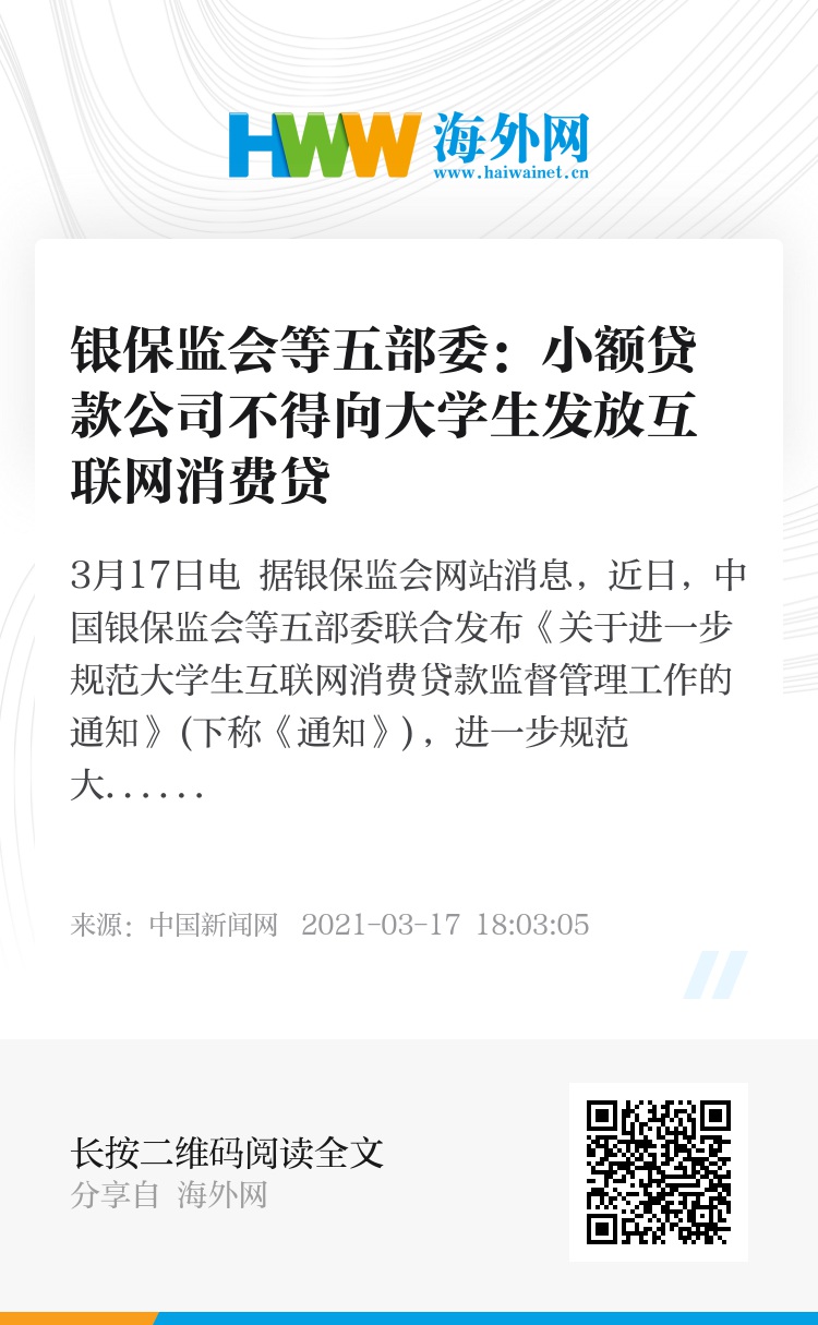 中新网3月17日电 据银保监会网站消息,近日,中国银保监会等五部委联合发布《关于进一步规范大学生互联网消费贷款监督管理工作的通知》(下称《通知》),进一步规范大学生互联网消费贷款监督管理,切实维护大学生合法权益。