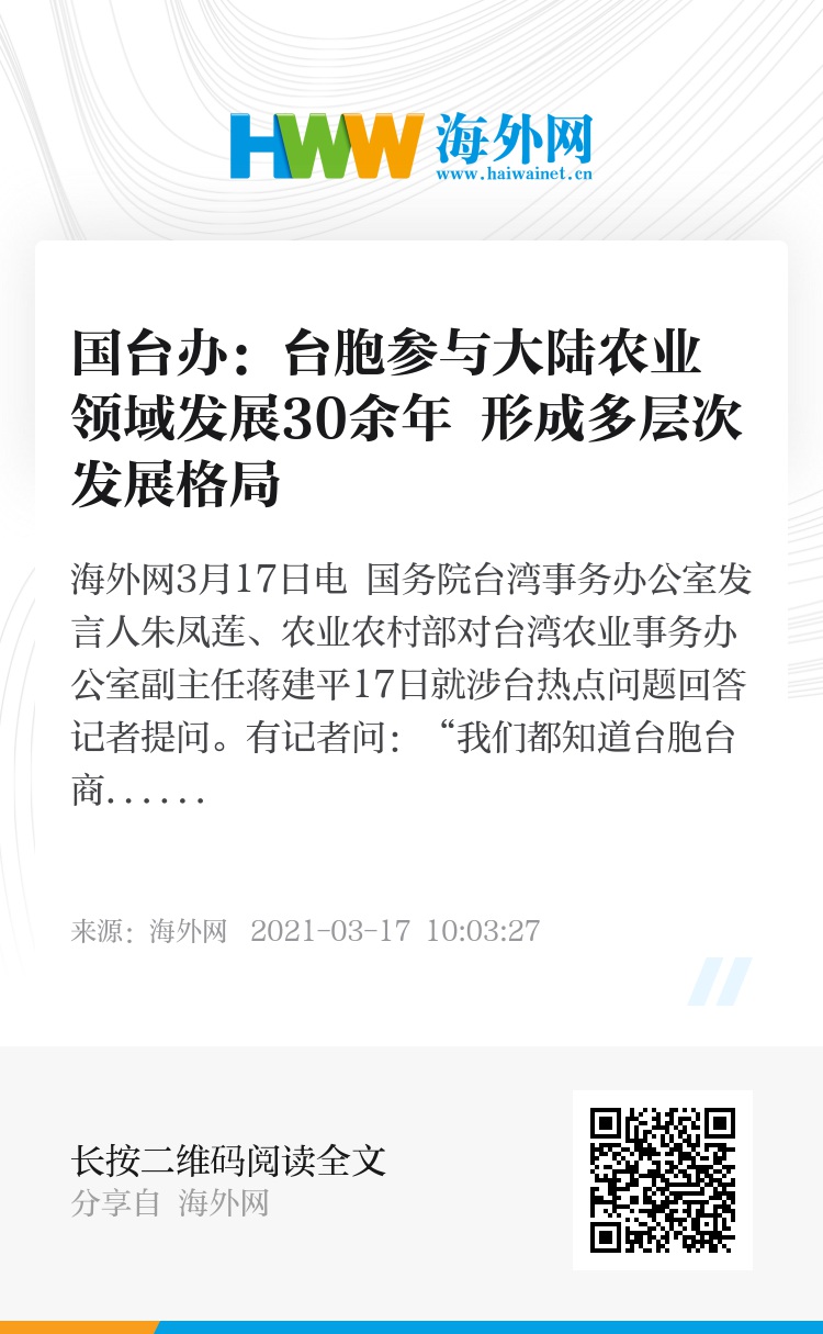 海外网3月17日电 国务院台湾事务办公室发言人朱凤莲、农业农村部对台湾农业事务办公室副主任蒋建平17日就涉台热点问题回答记者提问。