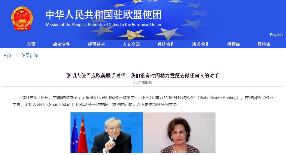 海外网3月18日电 据中国驻欧盟使团网站消息,2021年3月16日,中国驻欧盟使团团长张明大使出席欧洲政策中心(EPC)举办的“60分钟吹风会”(Sixty Minute Briefing),在线回答了欧洲学者、主持人莎达(Shada Islam)和观众关于欧美联手对华的问题。以下是这部分答问实录: