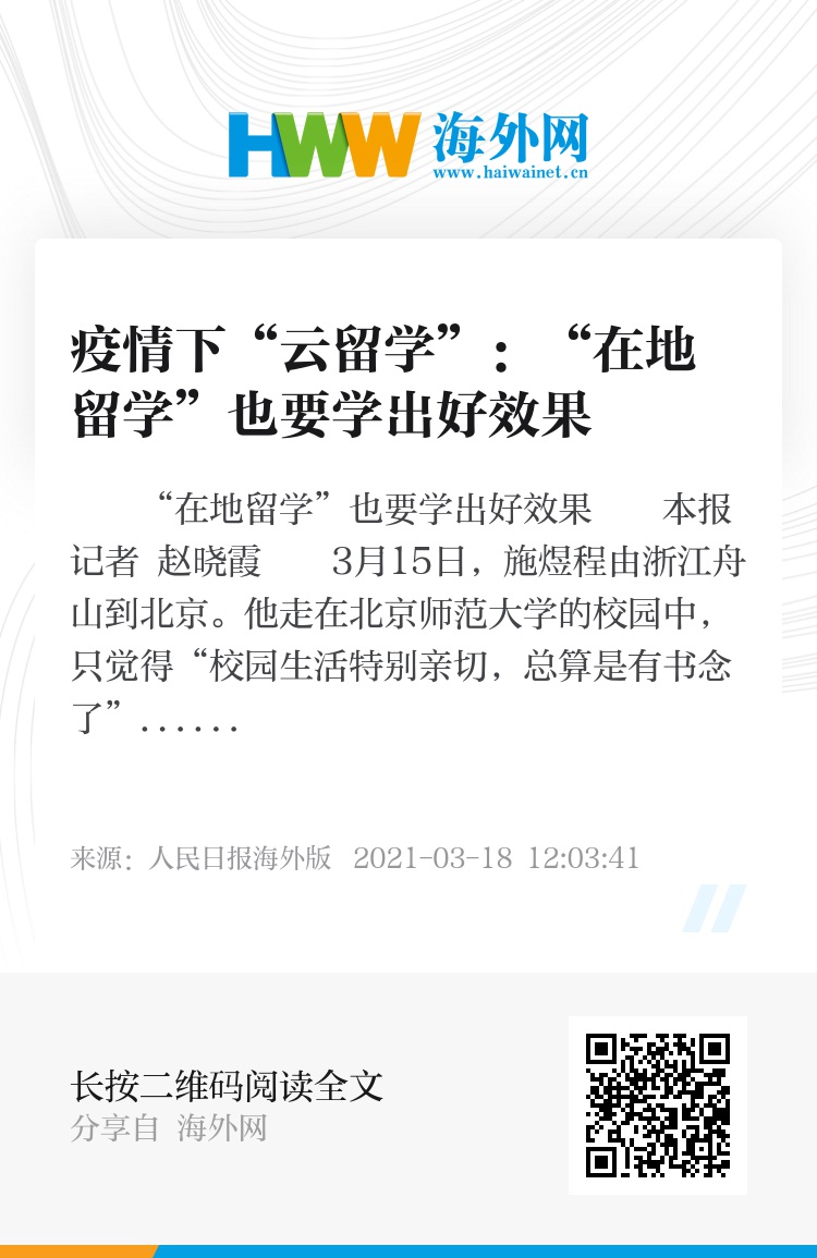 除了在家里上网课,也有中国学子选择在所就读院校的国内合作院校上课。据日前发布的由全球化智库与西南财经大学发展研究院共同编著的《中国留学发展报告(2020~2021)》蓝皮书显示,中外合作办学的实体机构以及具有良好合作关系的中外合作办学项目的中方院校,正成为本应在海外合作院校学习的中国学生开展线上和线下学习的重要载体,“在地留学”成为新冠肺炎疫情期间出国留学新的替代选择,比如纽约大学的3000名中国留学生可以在上海纽约大学开展学习。