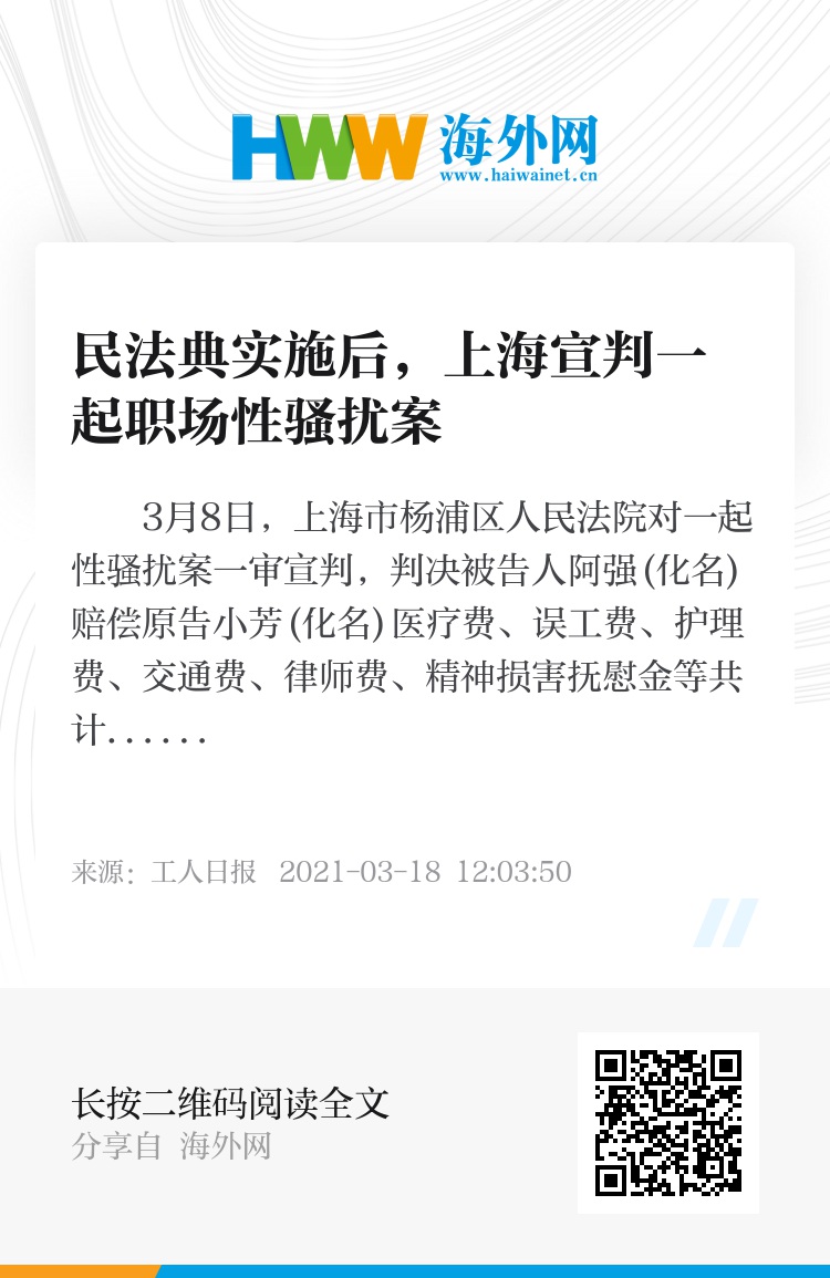 3月8日,上海市杨浦区人民法院对一起性骚扰案一审宣判,判决被告人阿强(化名)赔偿原告小芳(化名)医疗费、误工费、护理费、交通费、律师费、精神损害抚慰金等共计9.8万余元,并责令其向小芳书面赔礼道歉。法院表示,本案明确了不当言语也可构成性骚扰,对维护女性人格尊严起到了正向引导作用。