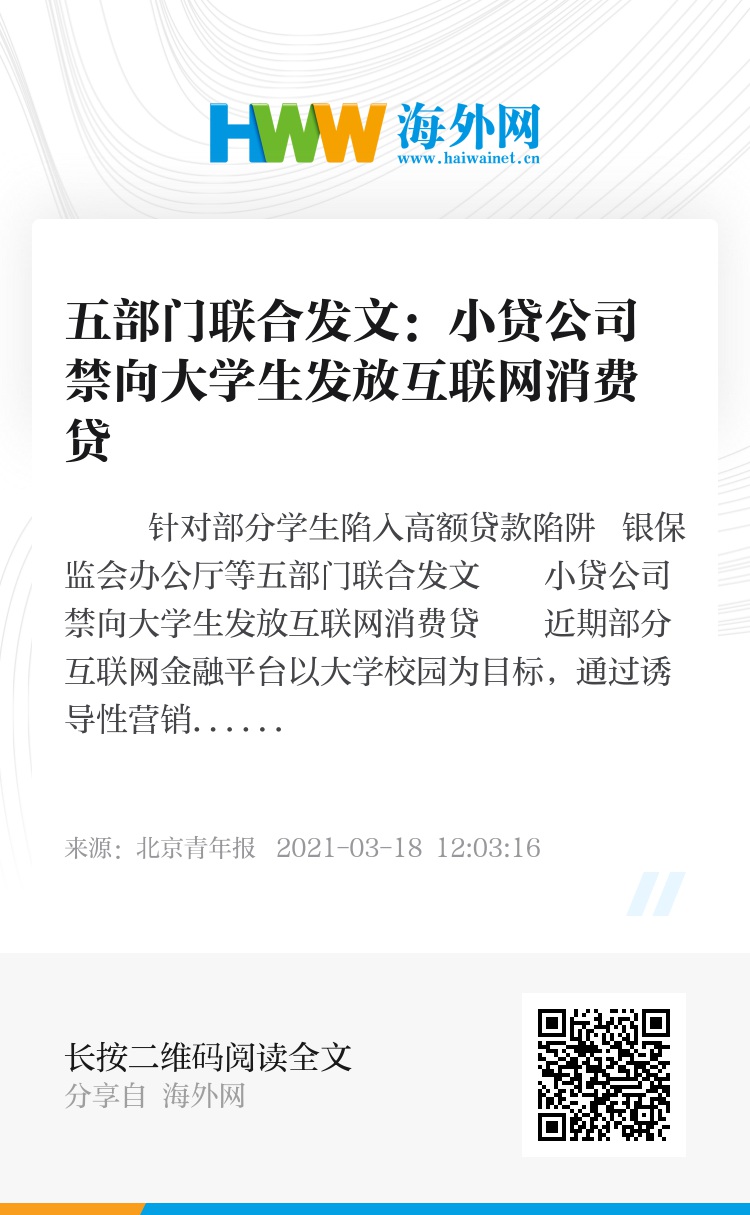 近期部分互联网金融平台以大学校园为目标,通过诱导性营销,发放互联网消费贷款,诱导大学生过度超前消费,导致部分学生陷入高额贷款陷阱的现象,引起监管部门高度关注。3月17日,北京青年报获悉,银保监会办公厅、中央网信办秘书局、教育部办公厅、公安部办公厅、人民银行办公厅近日联合印发了《关于进一步规范大学生互联网消费贷款监督管理工作的通知》(以下简称《通知》),从四个方面进一步规范大学生互联网消费贷款监督管理,切实维护大学生合法权益,同时部署开展大学生互联网消费贷款业务监督检查和排查整改工作。