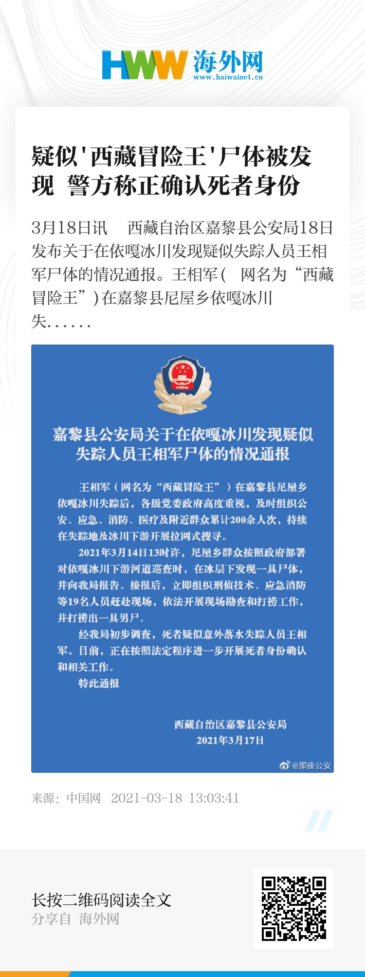 中国网3月18日讯 西藏自治区嘉黎县公安局18日发布关于在依嘎冰川发现疑似失踪人员王相军尸体的情况通报。