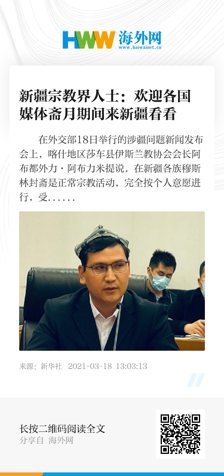 在外交部18日举行的涉疆问题新闻发布会上,喀什地区莎车县伊斯兰教协会会长阿布都外力·阿布力米提说,在新疆各族穆斯林封斋是正常宗教活动,完全按个人意愿进行,受法律保护,从来没有任何人干涉。西方有媒体说新疆“禁止穆斯林封斋”,这完全是造谣污蔑,他们的目的是挑拨新疆各民族之间的关系,蓄意制造中国与伊斯兰国家对立,这种丑恶行径令人不齿。“预计今年4月13日将进入斋月。我们欢迎各国媒体斋月期间到新疆走一走、看一看,了解新疆各族穆斯林斋月是怎么度过的,也欢迎到莎车来,到我家做客。”(记者孙楠)