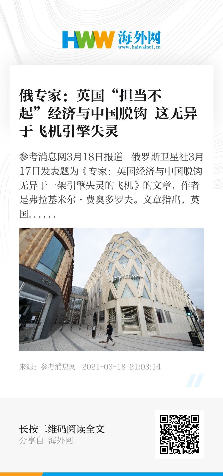 参考消息网3月18日报道 俄罗斯卫星社3月17日发表题为《专家:英国经济与中国脱钩无异于一架引擎失灵的飞机》的文章,作者是弗拉基米尔·费奥多罗夫。文章指出,英国经济与中国彻底脱钩以及与中国的严重经济对抗,将意味着英国将成为一架同时让两台发动机失灵的飞机,英国担当不起。全文摘编如下: