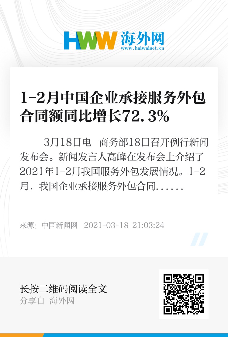 中新网3月18日电 商务部18日召开例行新闻发布会。新闻发言人高峰在发布会上介绍了2021年1-2月我国服务外包发展情况。1-2月,我国企业承接服务外包合同额1715.7亿元人民币(币种下同),执行额1144.5亿元,同比分别增长72.3%和70.6%,比2019年同期分别增长24.2%和31.8%。