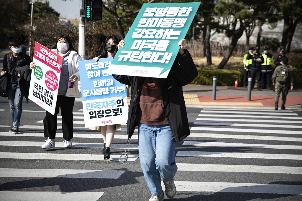 当地时间2021年3月17日,韩国首尔,抗议者在韩国国防部门口举行集会,抗议美国国务卿安东尼·布林肯和国防部长劳埃德·奥斯汀访问韩国。图片来源:人民视觉