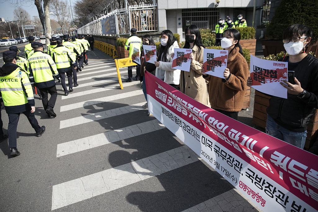 当地时间2021年3月17日,韩国首尔,抗议者在韩国国防部门口举行集会,抗议美国国务卿安东尼·布林肯和国防部长劳埃德·奥斯汀访问韩国。图片来源:人民视觉