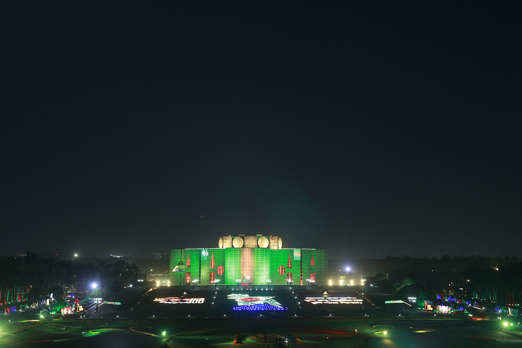 当地时间3月17日,在庆祝孟加拉国国父谢赫·穆吉布·拉赫曼诞辰一百周年纪念日之际,位于首都达卡的国家议会大厦亮起彩色灯光。图片来源:视觉中国
