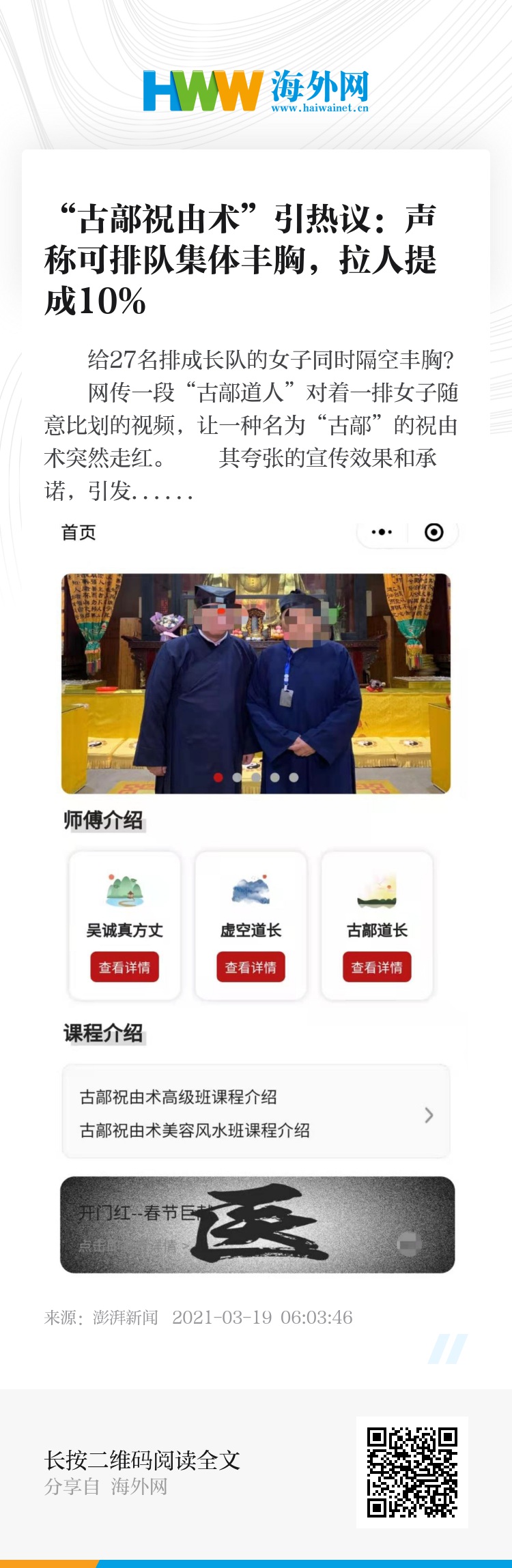 “施咒者通过语言的形式准确无误传达自身目的,然后乖巧地等待神秘力量的帮助。”澎湃新闻发现,“古鄗道人”网站和“古鄗祝由术”微信公号都曾提起前述丰胸术课程。