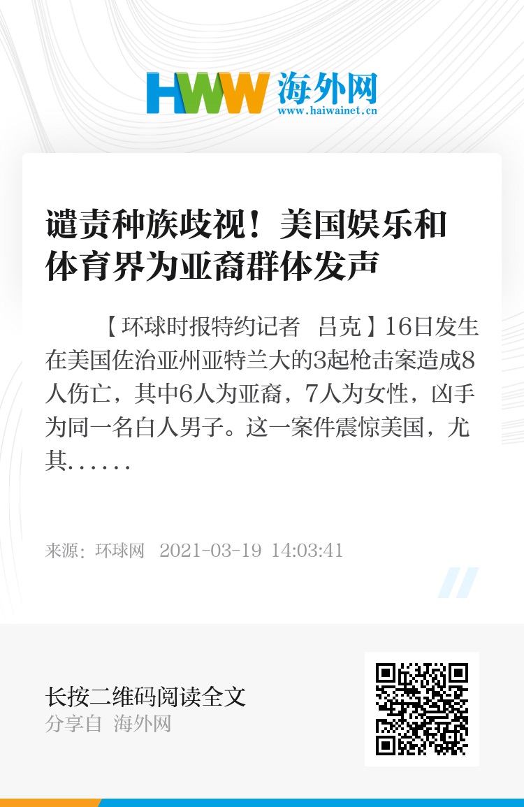 亚特兰大老鹰队球星特雷・杨也向这场悲剧的受害者和家属表示慰问,亚裔球星林书豪的悲伤和愤怒溢于言表:“心碎了。对于我们亚裔家庭,除了悲伤,更应该坚强、团结起来,直言不讳,为了变革而战斗,不能丧失希望!”
