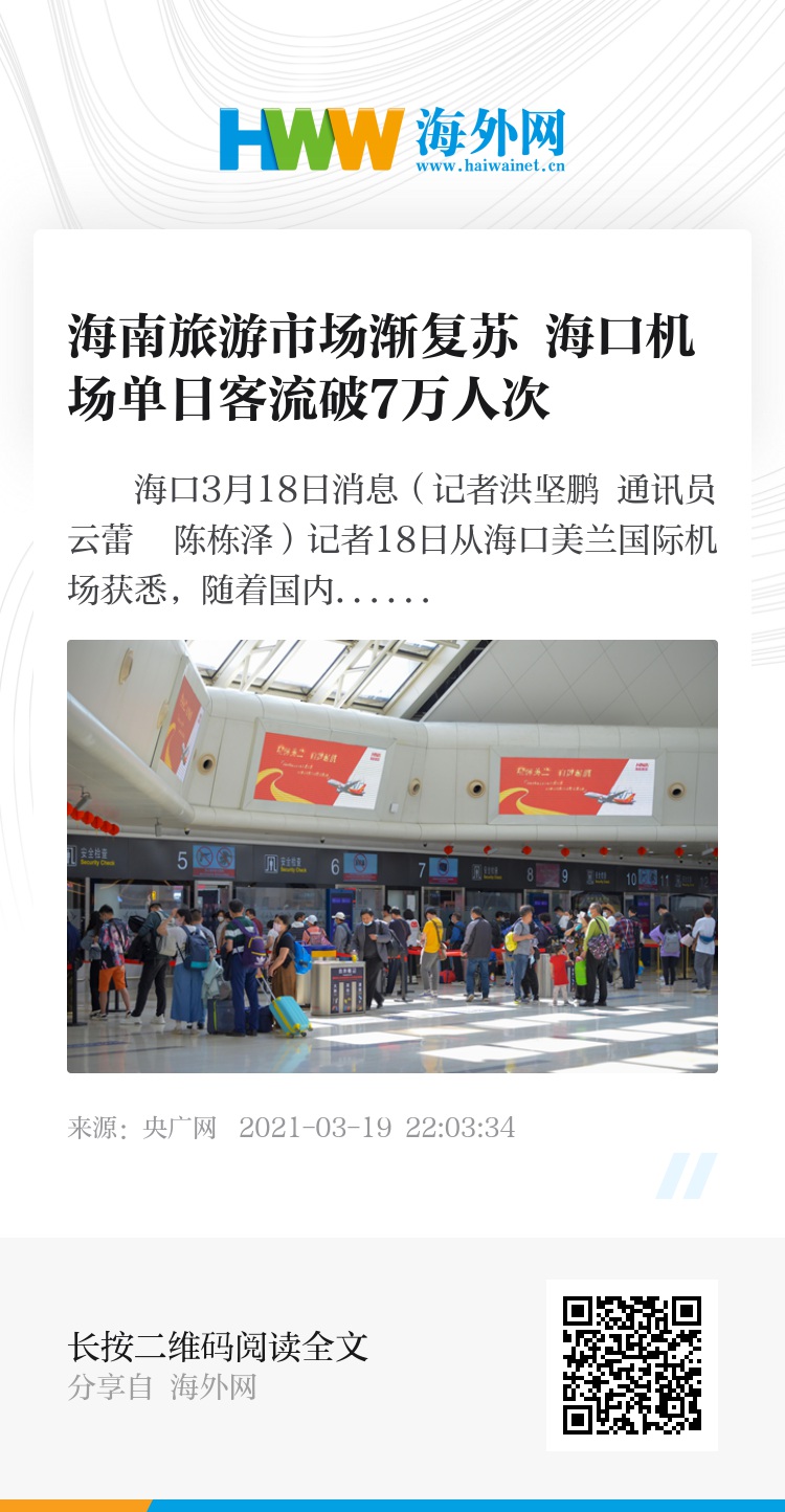 央广网海口3月18日消息(记者洪坚鹏 通讯员云蕾 陈栋泽)记者18日从海口美兰国际机场获悉,随着国内常态化疫情防控形势稳定向好,海南旅游市场逐渐复苏。该机场3月16日航班量达到496架次,客流量超过7.06万人次,生产运输数据创下2021年以来新高。