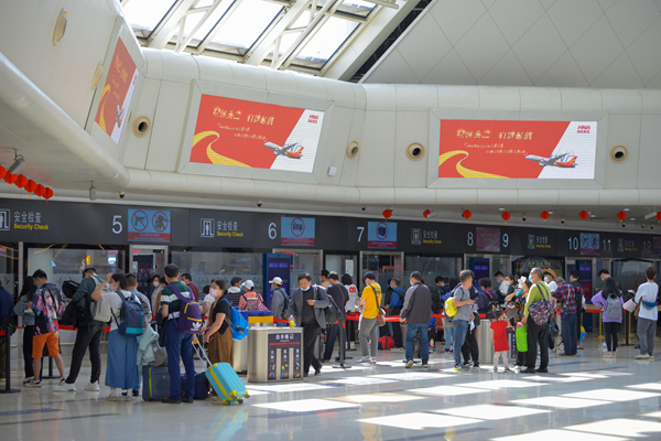 图为旅客在美兰机场安检待检区排队。 严锐 摄