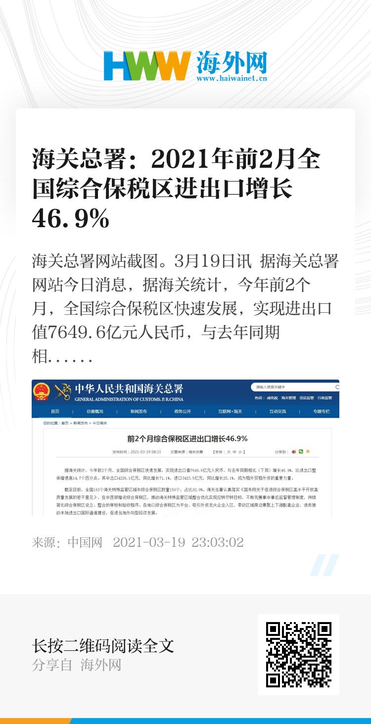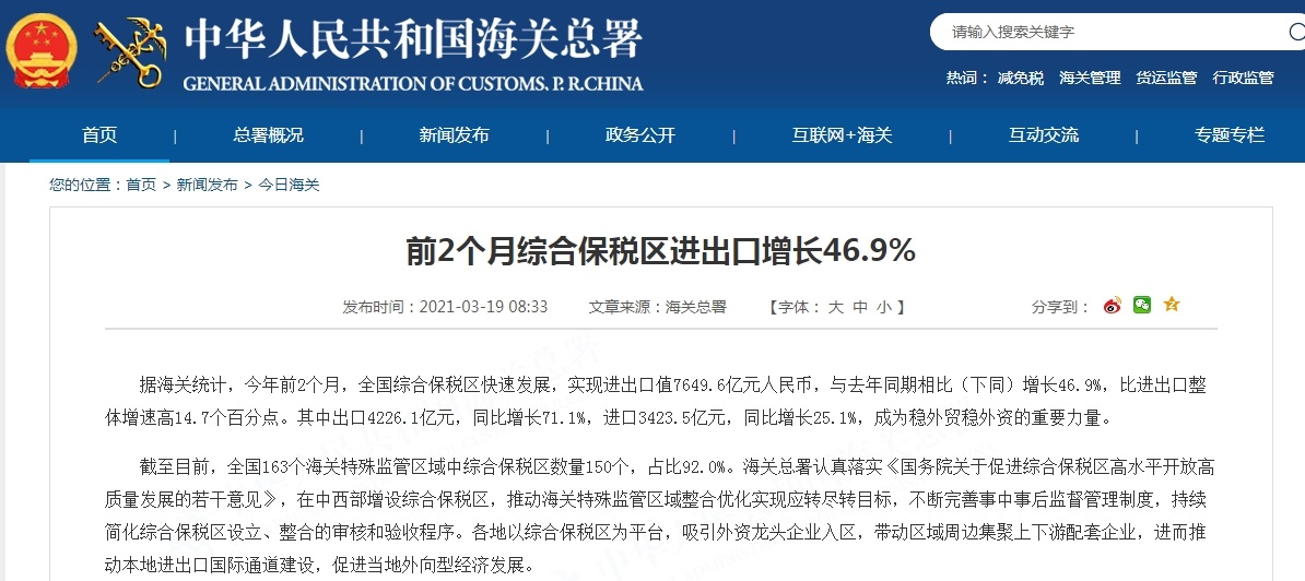 中国网3月19日讯 据海关总署网站今日消息,据海关统计,今年前2个月,全国综合保税区快速发展,实现进出口值7649.6亿元人民币,与去年同期相比(下同)增长46.9%,比进出口整体增速高14.7个百分点。其中出口4226.1亿元,同比增长71.1%,进口3423.5亿元,同比增长25.1%,成为稳外贸稳外资的重要力量。