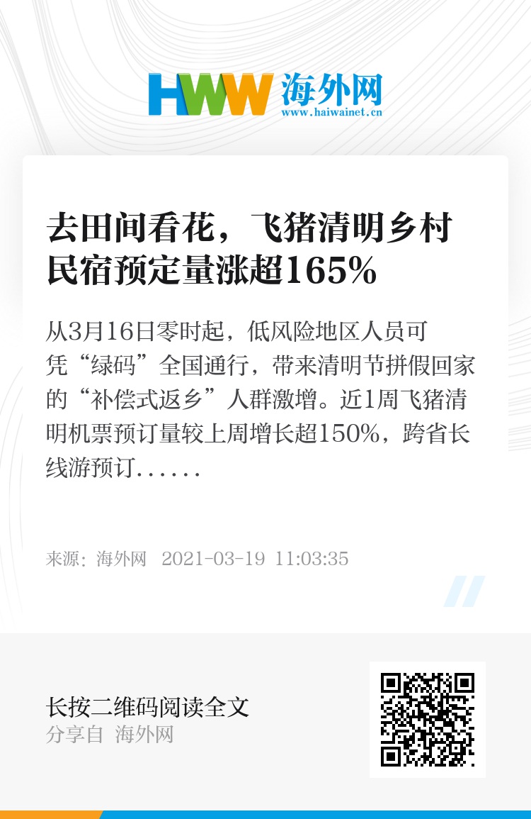 从3月16日零时起,低风险地区人员可凭“绿码”全国通行,带来清明节拼假回家的“补偿式返乡”人群激增。近1周飞猪清明机票预订量较上周增长超150%,跨省长线游预订量较前一周增长超170%。周边游赏花踏春也是消磨清明小长假的好选择,飞猪乡村民宿预订量增长超165%。