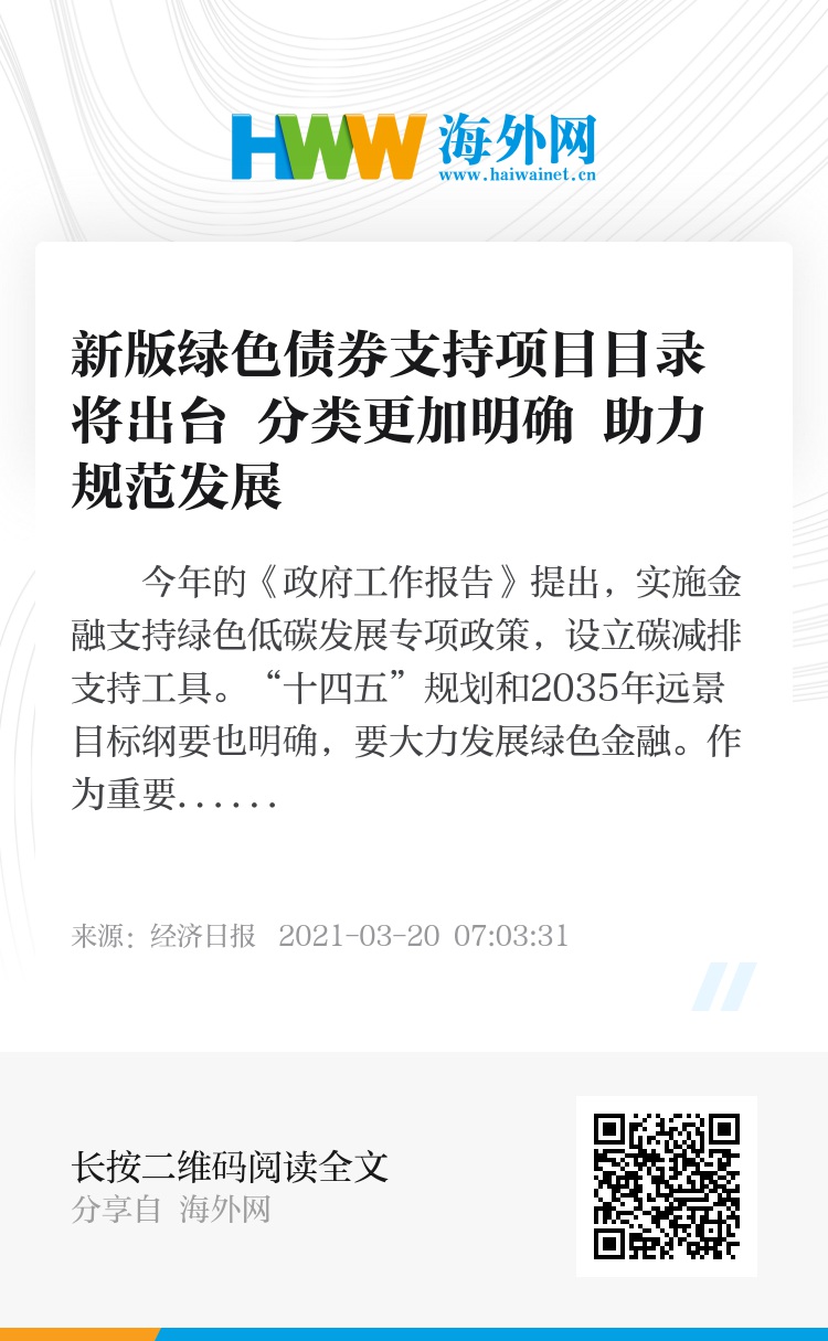 《绿色债券支持项目目录(2020年版)》在2020年7月由人民银行、发改委和证监会联合向社会公开征求意见,对《绿色产业指导目录(2019年版)》三级分类进行细化,增加为四级分类,绿色项目的分类标准体系更加明确。专家表示,新版目录的修整,意味着有更多的绿色项目将被贴上“绿色标签”,这不仅有助于绿色项目的推广和应用,而且有利于我国绿色债券市场规范发展。今年2月,人民银行研究局局长王信在国新办吹风会上表示,央行将出台统一的新版《绿色债券支持项目目录》。