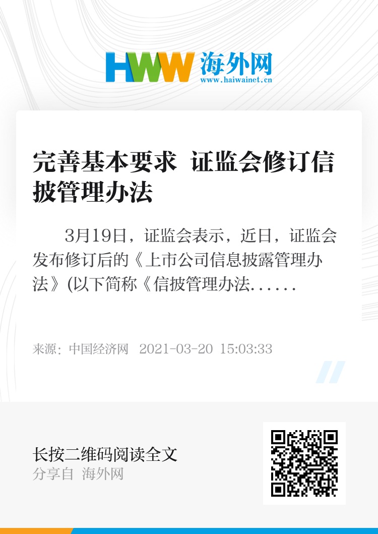 3月19日,证监会表示,近日,证监会发布修订后的《上市公司信息披露管理办法》(以下简称《信披管理办法》),自2021年5月1日起施行。