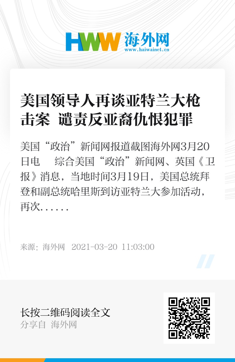 拜登和哈里斯此访正值美国针对亚裔仇恨情绪激增之际。16日,一名21岁白人男子在美国亚特兰大地区的三家按摩店枪杀8人,其中6人为亚裔女性。美国反仇恨亚裔组织表示,枪击事件是“无以言表的悲剧”,会进一步加剧亚裔群体的恐惧和痛苦。(海外网 张琪)