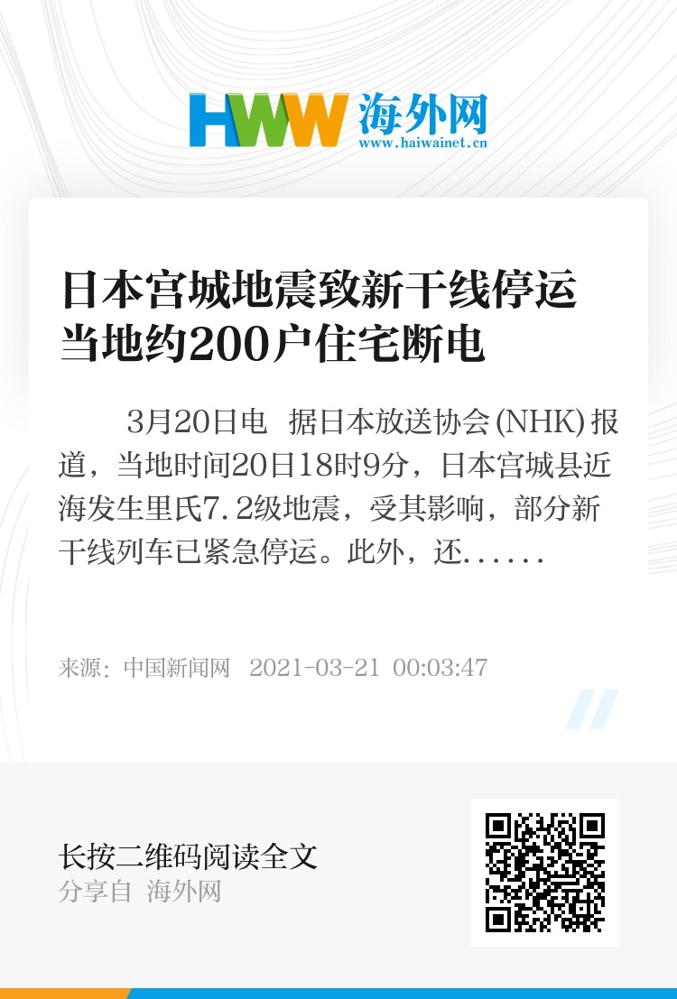 此外,根据日本东北电力公司发布的消息,地震发生后约6分钟,宫城县栗原市约200户住宅断电。